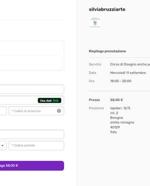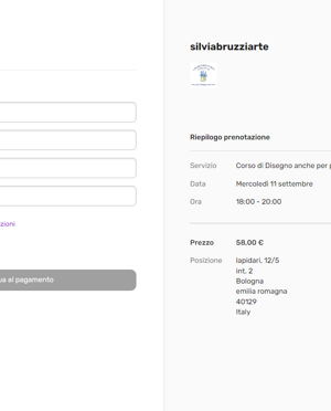 HO NECESSITA' DEI SEGUENTI DATI: NOME, COGNOME, VIA, N.CIVICO, CAP, CITTA' E CODICE FISCALE UN RECAPITO PER CONTATTARVI IN CASO DI ANNULLAMENTO O SPOSTAMENTO DEL LABORATORIO,PER EMETTERE LA FATTURA ELETTRONICA OBLIGATORIA